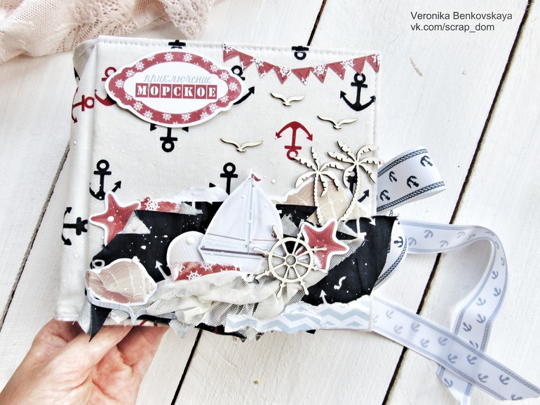 Обложка альбомчика сюжетная:здесь и море из ткани, и сетка, и много ракушек-звездочек,и чайки, и пальмы, а еще есть кораблик, на котором виртуально проходило празднование дня рождения.