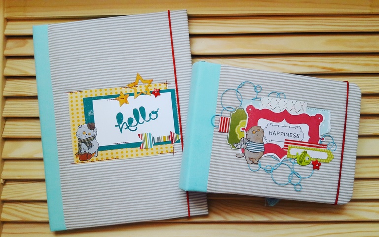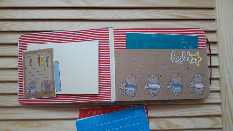 Первый разворот тканевый. Вместо скрапбумаги использовала ткань полосатенькую на клеевой основе, очень довольна, удобно ее использовать.