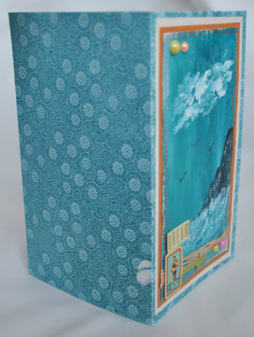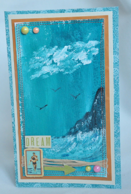 вообщем открытка простая...здесь основное конечно рисунок.....жаль его было сильно прикрывать декором...вроде все цвета палитры соблюдены....стрелка и надпись светло-зеленого цвета.....полубусинки розовые и желтые...рафия-бежевая,черный-скала и птички,белый-облака и волны и основа бирюзовый и оранжевый и акварельная бумага..она больше бежевая....