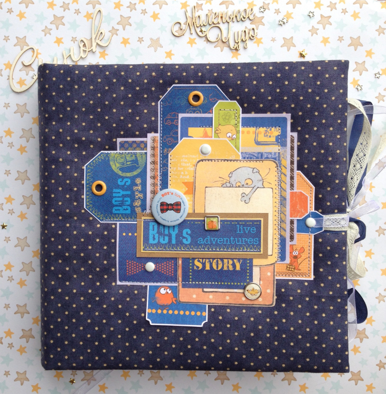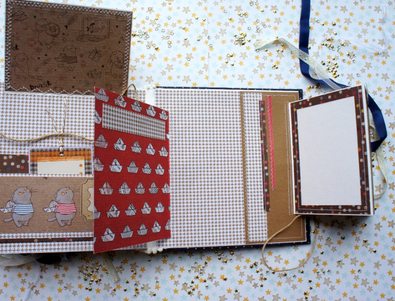 В альбоме пять разворотов со множеством раскладушек и кармашков с тегами и карточками для фотографий и записей.