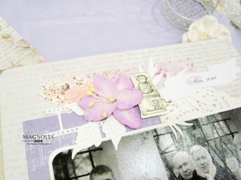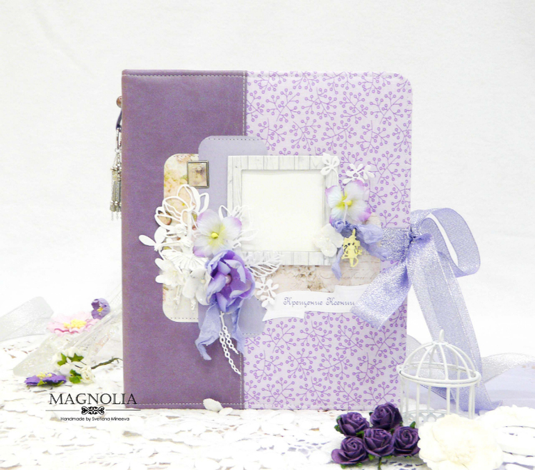 Обложка обтянута эко-кожей фиолетового цвета и хлопком, украшена объемными цветами, рамочкой с фотографией (внизу прикреплен видеообзор). В основе альбома прошитый тканевый переплет. А вот страниц немного, всего 4 разворота плюс один скрытый на магнитах, итого всего 10 страничек