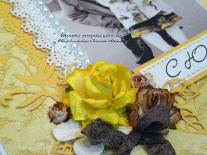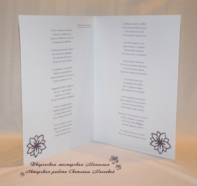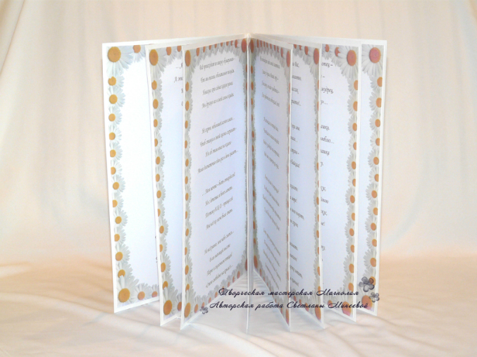 Открытка сделана по типу книги, так как вмещается в ней аж 14 страниц стихотворного текста. Формат А4. Было столько пожеланий....чтоб была желтая роза на тутульнике, чтоб была девочка с розами и тоже желтыми, текст на титульнике в виде печатной вырезки, внутри поздравительный стих должен быть обрамлен ромашками, определенным образом выделены части текста, в конце вставлены девочка и мальчик с желтой розой.