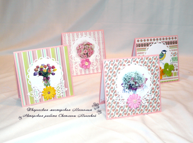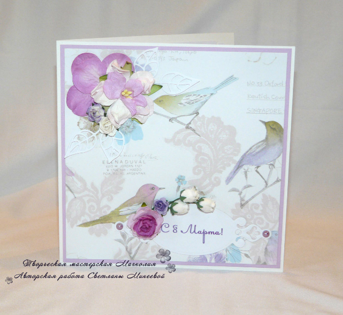Серия мини-открыток "Птичьи трели" к 8 марта, размер 10*10 см, внутри вкладыши для поздравлений