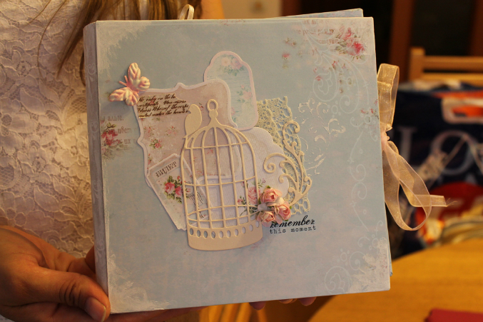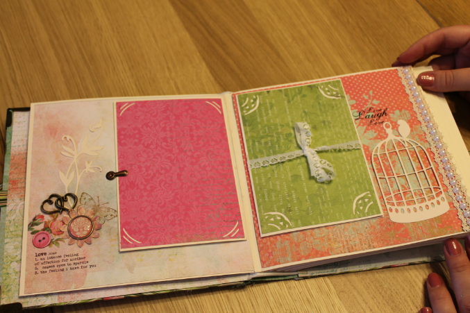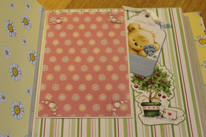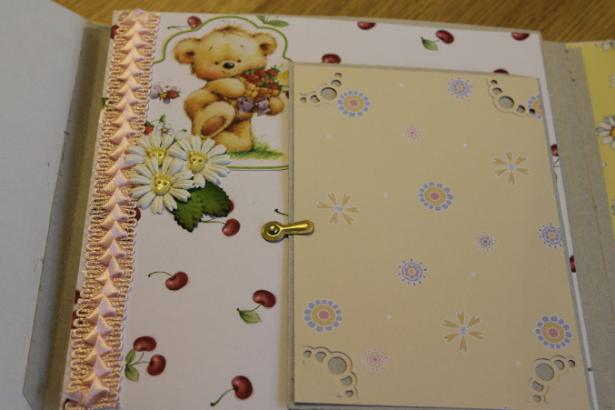 На самих страничках мы научились делать под фотографиями потайные кармашки,раскладные фото на завязках и раскладные фото с использованием брадсов и анкеров.