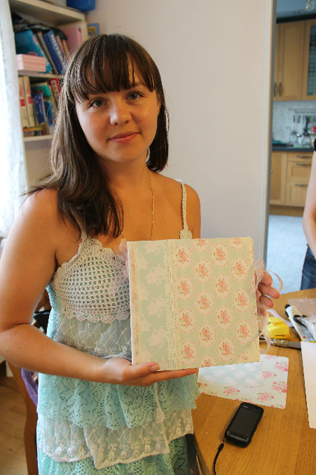 За неделю до МК неожиданно для себя (и благодаря влиянию Светы и Саши) я решила попробовать переплет Виноградовой-и не прогадала,нашла кучу плюсов для себя.Теперь буду делать только его! В самом МК Виноградовой есть некоторые проблемы и трудности,по моему мнению,и я придумала несколько иной способ сбора переплета! Он легче и переплет сразу получается аккуратный и ровный,да и к тому-же он быстрей) Вот такое ноу-хау) В общем на самом МК я предложила девочкам на выбор переплет Ромашиной или Виноградовой в моей доработке-показала наглядно на своих альбомах примеры обоих переплетов. В общем все девочки.кроме Жени,решили делать Виноградову.Женя делала Ромашину-ну нравится человеку и все) Теперь несколько фоток процесса и того,что в результате вышло.