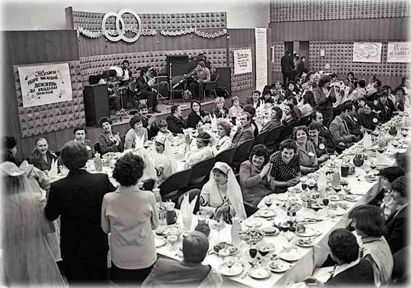 Очень нетипичная свадьба СССР. Даже можно сказать что БОГАТАЯ свадьба. Обычно столы накрывали в квартире и сидели как селедки в бочке, откушивая оливье и селедочку с картошечкой. А на вашем фото ресторан, да еще и с живой музыкой, роскошь не иначе.