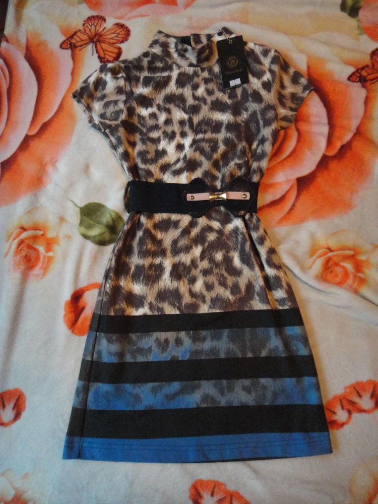 27.Новое платье Diren Kids, р.36 (140). Изделие выполнено из плотного трикотажа (64% полиамид, 30% вискоза, 6% эластан). Округлая горловина, короткие рукава. По талии съемный пояс-резинка на кнопах с яркой пряжкой. Застежка - 2 пуговицы на шее сзади. Длина по спинке - 78 см. Экв. 1600 руб.