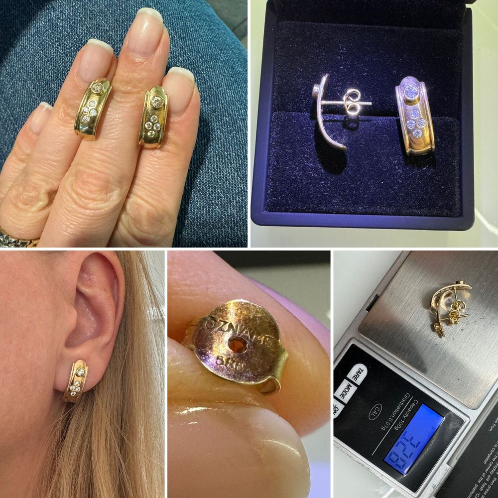 Золотые серьги-пусеты. Цирконы в бриллиантовой огранке. Золото проверила, соответствует пробе. 18500 руб