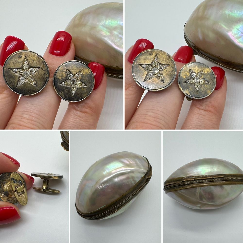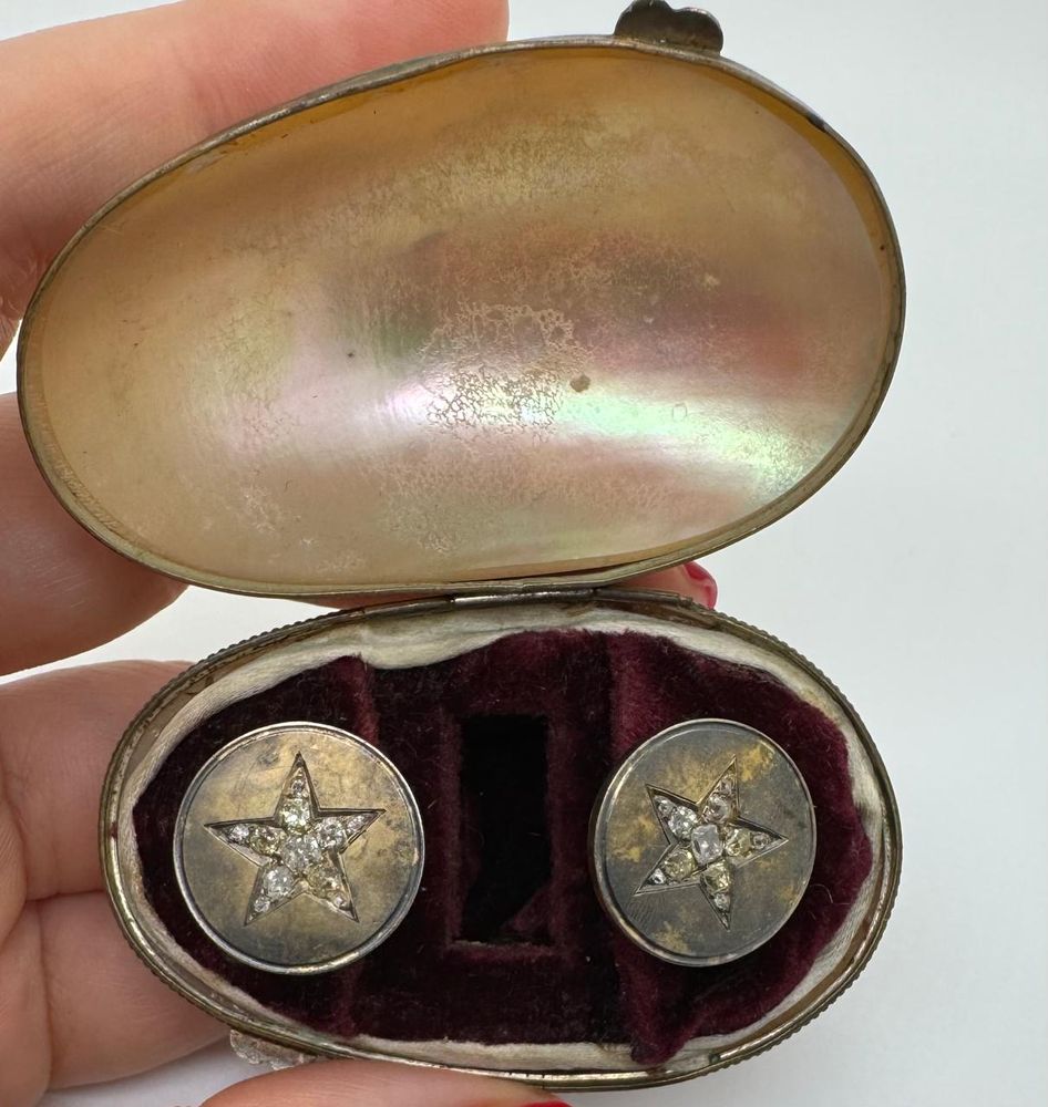 Редкие антикварные запонки золото с бриллиантами в оригинальной коробочке-яйце из перламутра
