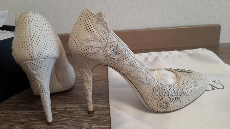 1. Мои свадебные туфельки. На 36,5 размер. Кожа, кристаллы Сваровски. Кожа на подошве подтерлась, нужно профилактику поставить. Экв 12 000 руб.