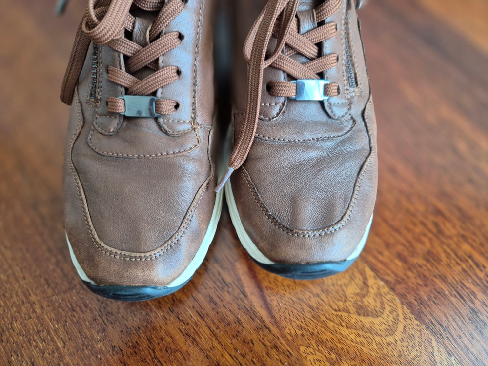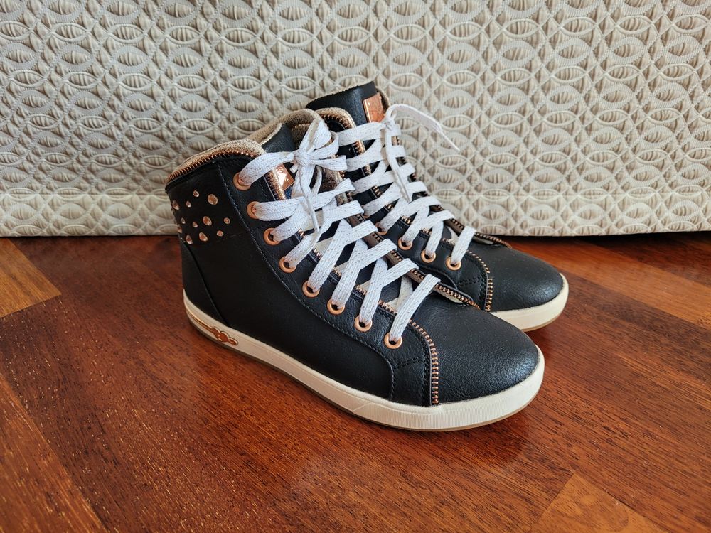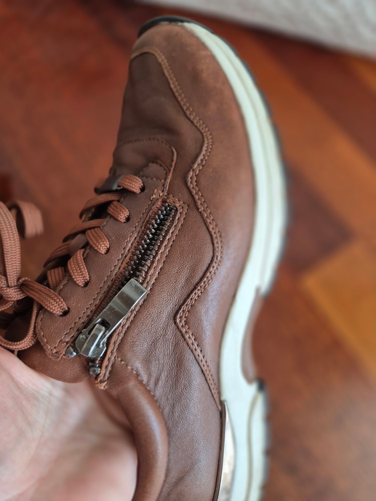 34. Очень удобные кроссовки, натуральная кожа. Размер 37. Любила их очень, есть еще одни такие в другом цвете. Эти пристрою, очень много обуви. По состоянию - на фото все видно чуть светлее кожа на носах стала, она не ободрана, просто потерлась чуть, молния сломана. Можно починить или пользоваться шнурками. или просто с ложкой обувать. Экв 3000 руб.