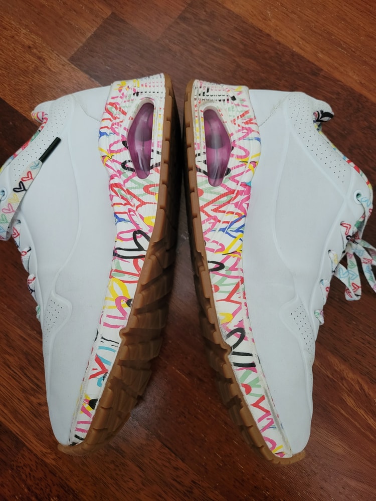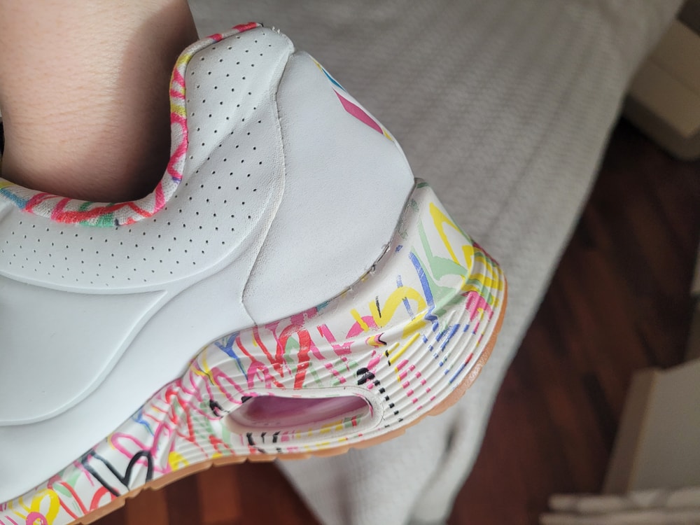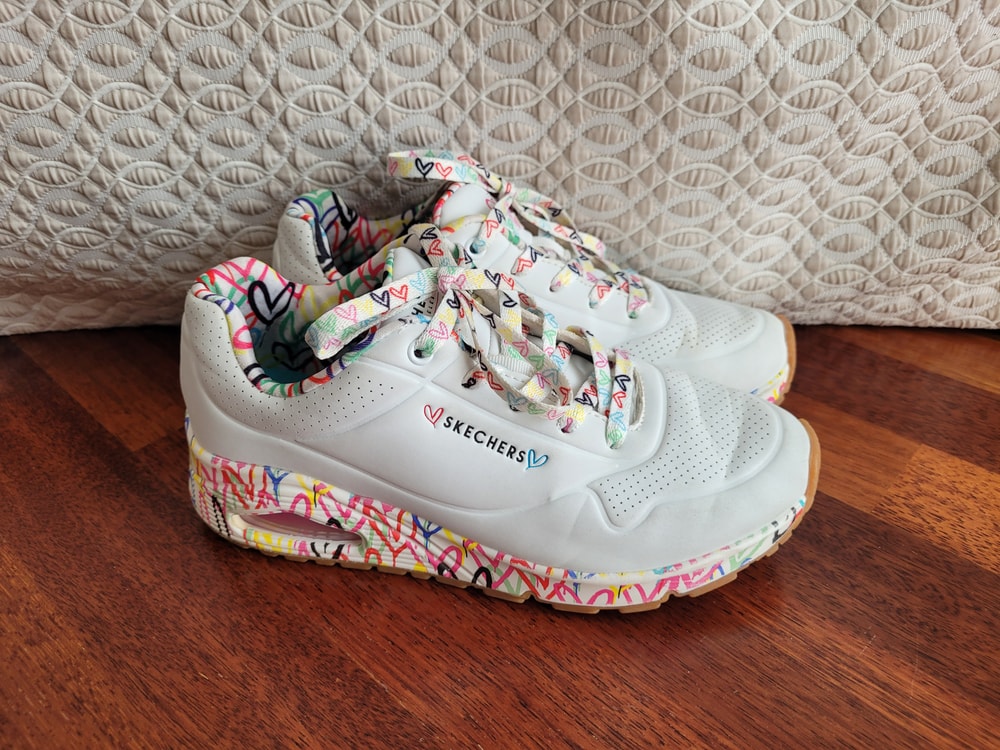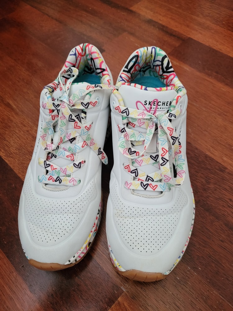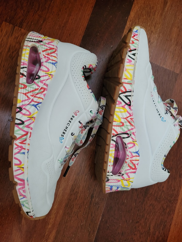 26. . Skechers Uno кроссовки из коллекции коллаборации с каким-то художником. Куплены в Европе. Очень удобные. Размер 37, но маломерки на размер. Носила дочь. Состояние очень хорошее. Есть потертости, в глаза на ноге особо не бросается, но я прохожусь периодически белой краской для обуви специальной - последнее фото. Экв 5000 руб.