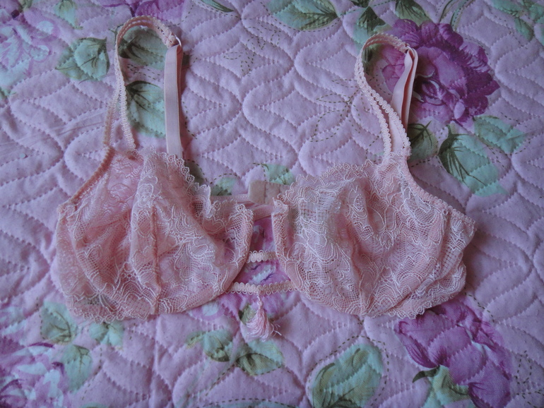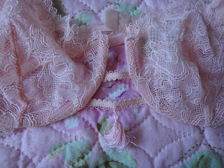 9.Нежно-розовый бюстик, р.80С. На косточках, бретельки регулируются. Между чашками - кисточка-подвеска. Экв. 500 руб.