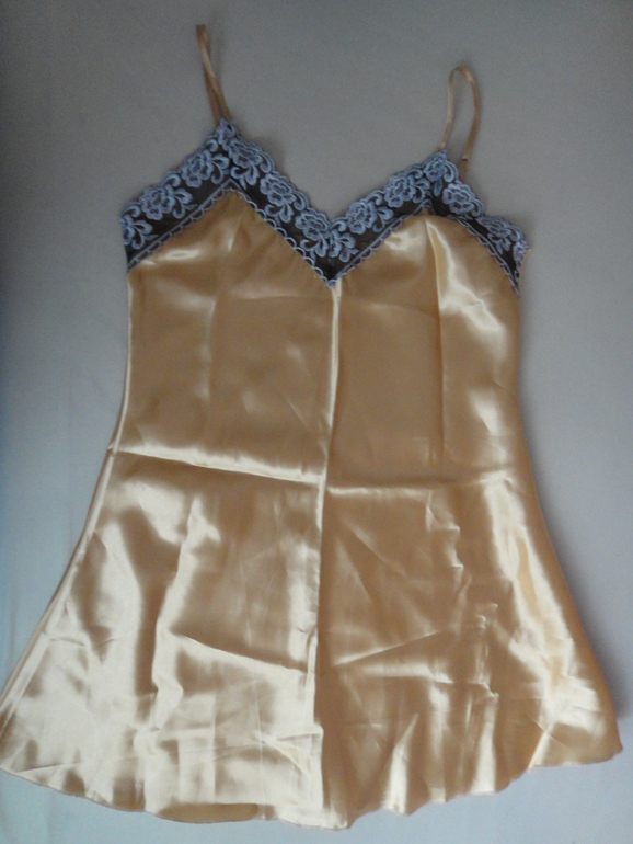 2.Новая сорочка, р.44-46. Золотистый цвет, атласная, бретельки регулируются. Длина около 80 см. Без бирки. 450 руб.