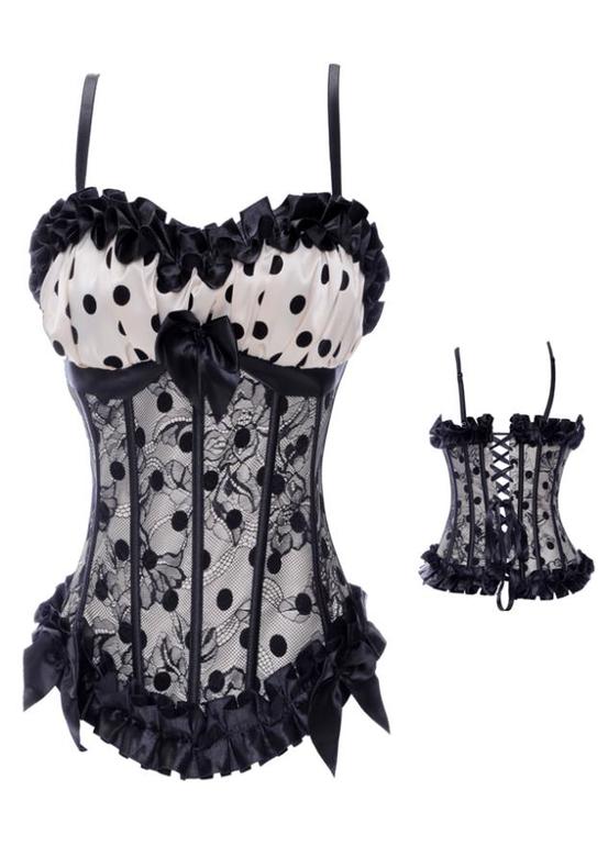 1.Новый очаровательный корсет бежевого цвета в черный горох, с рюшами, декоративными бантиками и черной сеткой. С мягкими сформированными чашечками. На молнии сбоку и люверсах сзади. Без бирок. Бретельки съемные, регулируемые. 82% спандекс, 18% нейлон. На грудь до 3 размера. Экв. 1600 руб.