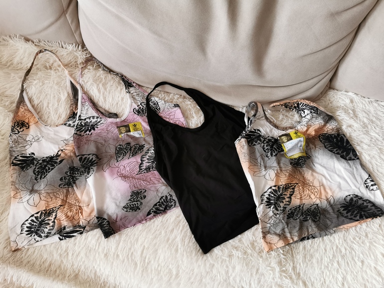 Топики, бретелька через шею, спина открыта. Состав вискоза и лайкра. Размер 40-42 (тянутся). На высокий рост будут коротковаты. Осталось 4 шт. Экв 100 за все