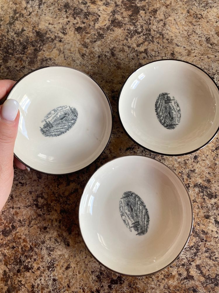 3 мисочки под соус или варенье, меняла как новые, насколько помню, оказались мелковаты мне. За 3 - экв 600. На той, что в руке - небольшое затемнение, на фото видно.