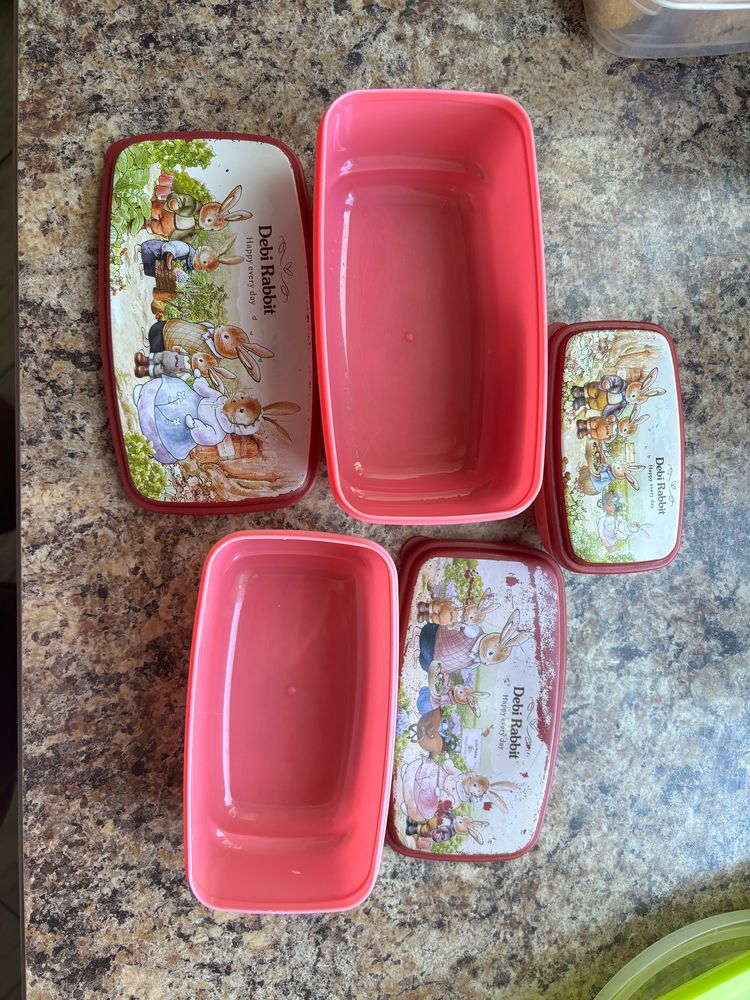 набор небольших/маленьких контейнеров 3 шт бу, крепко закрываются, есть потертости рисунка крышки от мытья. 500 за набор