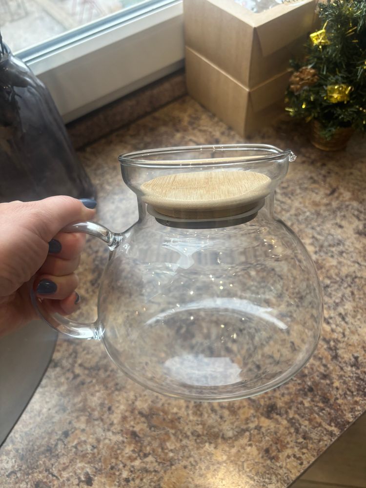 чайник большой стекло. Бу в хорошем состоянии. На 0,7-1 л , мне кажется. Крышка была стеклянная, но разбили, взамен купила подходящую металл-дерево. Экв 1300