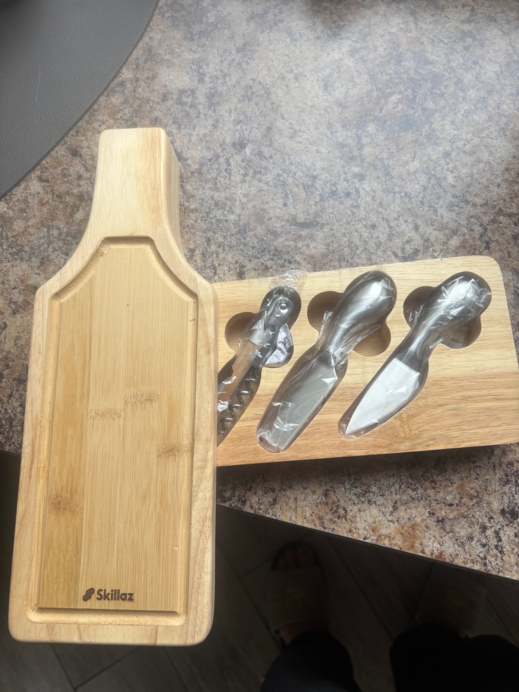 доска для закусок и сыра новая , в комплекте 2 ножа и штопор. Сама была без пленки в подарке, ножи в упаковках. 2000
