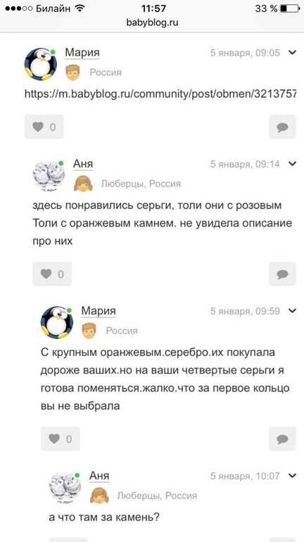 ОБМЕН.обменялась сережками. договорились с девушкой на обмен серебряными сережками. Мария у меня серебрянные с опалом, с биркой отдала. (менялась здесь с девушкой ими по почте, и все отлично прошло. )за эти серьги понравились серебрянные с цирконами( так было заявлено) .пост с ними уже удалён. сначала договаривались встретиться в центре, но я заболела бронхитом, соответственно не выездная. девушка сама предложила приехать ко мне. обменялись, зашла домой, начала рассматривать заподозрила что не серебро, позвонила ей, трубку не взяли(прошло пару минут) , могла бы вернуться. решила дойти до ломбарда, хорошо что в соседнемдоме. там девушка подтвердила что это не серебро. пробы нет серебра. она даже проверила их на какую то реакцию, не понимаю в этом. в итоге это бижутерия. звоню, мне говорят, что её получается тоже обманули, но я то почему от этого должна страдать? я то серебро поменяла. ко мне она не поедет больше, по почте она не меняется. и я должна приехать к ней в Подмосковье, я в итоге согласилась приехать,но вот стандартная песня, это будет не скоро, так как к маме уезжают. решила мужа отправить на обмен к ней после работы, звоню, а трубку не берет и скидывает. нервы себе тратить не буду. пусть на совести останется.