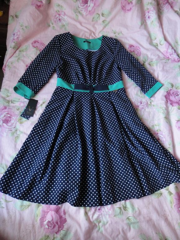 1.Новое платье "Мода Версаль" (Брест), р.46-48. Темно-синее в белый горох. Маркировка производителя: ОГ - 92 см., ОБ - 100 см., рост - 164 см. Застежка - молния сбоку. Пояс декорирован бантом и подвеской с сердечком. Длина - 100 см. Экв. 4500 руб. Обмен выборочно (не по мелочи).