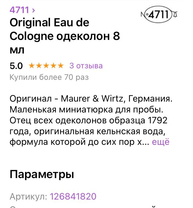 Одеколон миниатюра новая 8 мл. Экв. 400