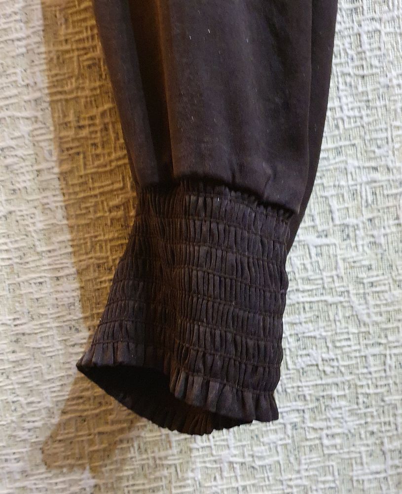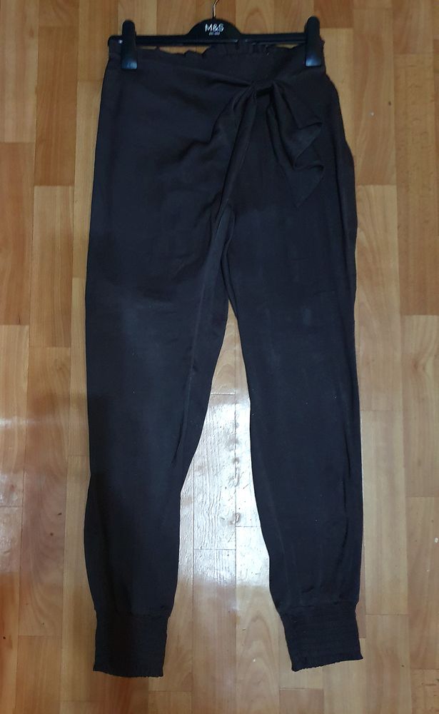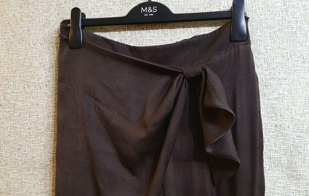 Очень стильные дизайнерские брюки, невесомые, как шёлк, но это не шёлк,хотя стоимость была как за шелк))) цвет красивый тёмный шоколад, р 44-46 пояс сзади на резинке поэтому трудно сказать по размеру,крой интересный, мне стали велики, б/у мало c боку в районе бедра с изнанки есть зацепка, не видно ее, экв с учетом этого недочета поставила 200р