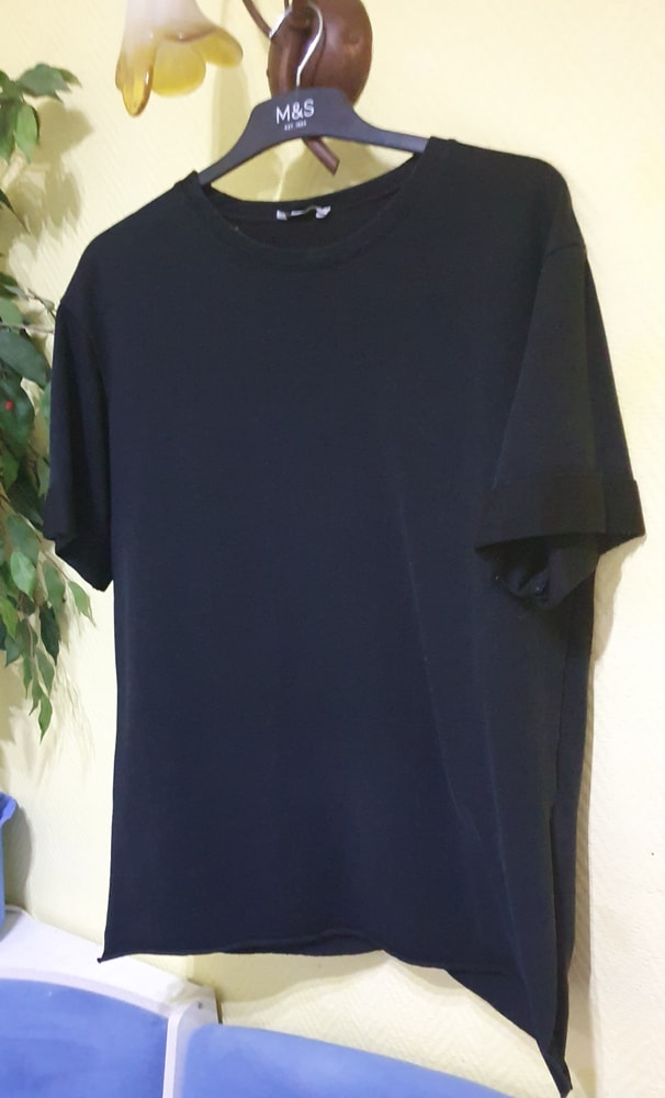 Футболка черная, б/у состояние нормальное ,оверсайз на р от 44-50 , просто по разному сидеть будет, крой прямой,разрезы по бокам, плотный хлопок, при росте 164 попу закрывает 300руб