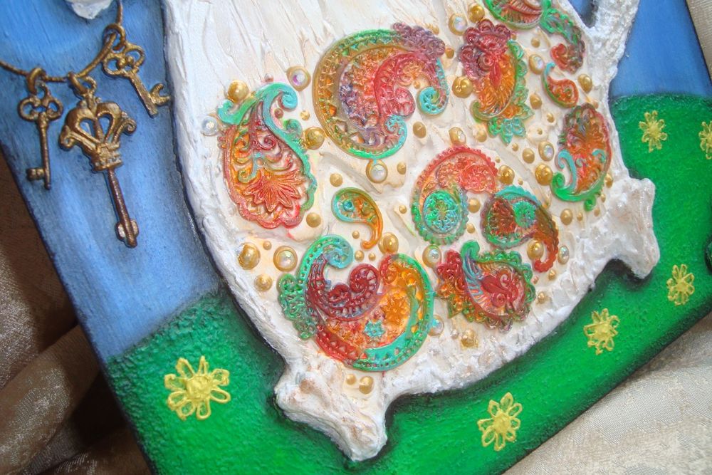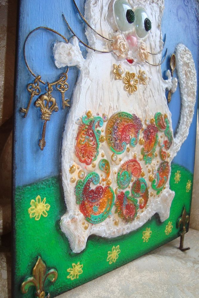 Материалы: текстурная паста, акриловые краски, лаки. С использованием фурнитуры, имитирующей настоящие корону, ключи, часы и, главное - КЛЮЧИ от дома, дачи, машины и даже СЕРДЦА! Фантазия обладателя - его МИР! Котик сбережет все, что дорого именно Вам!