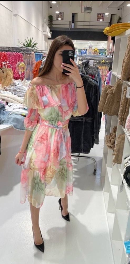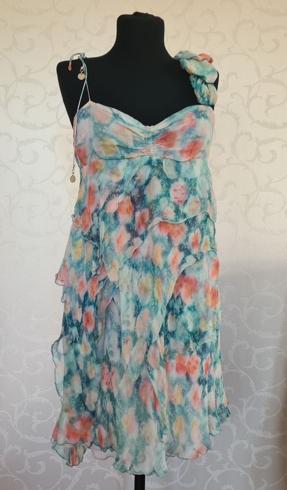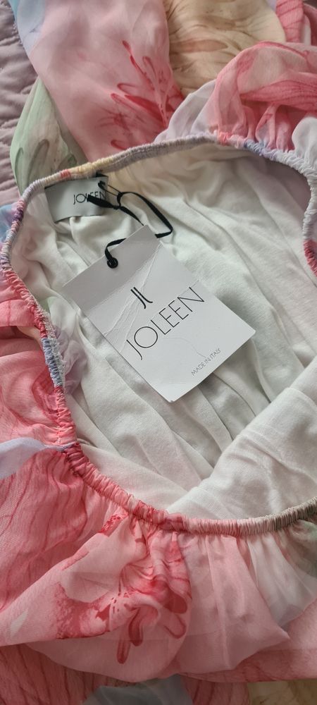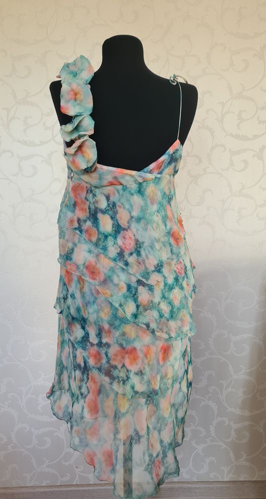 Шикарное Joleen, в талии резинка, прекрасно сядет до 44 полного размера, плечи можно поднять, шифон, подклад 95% вискоза, 5% эластан, только простирнула, не носила, 9000=