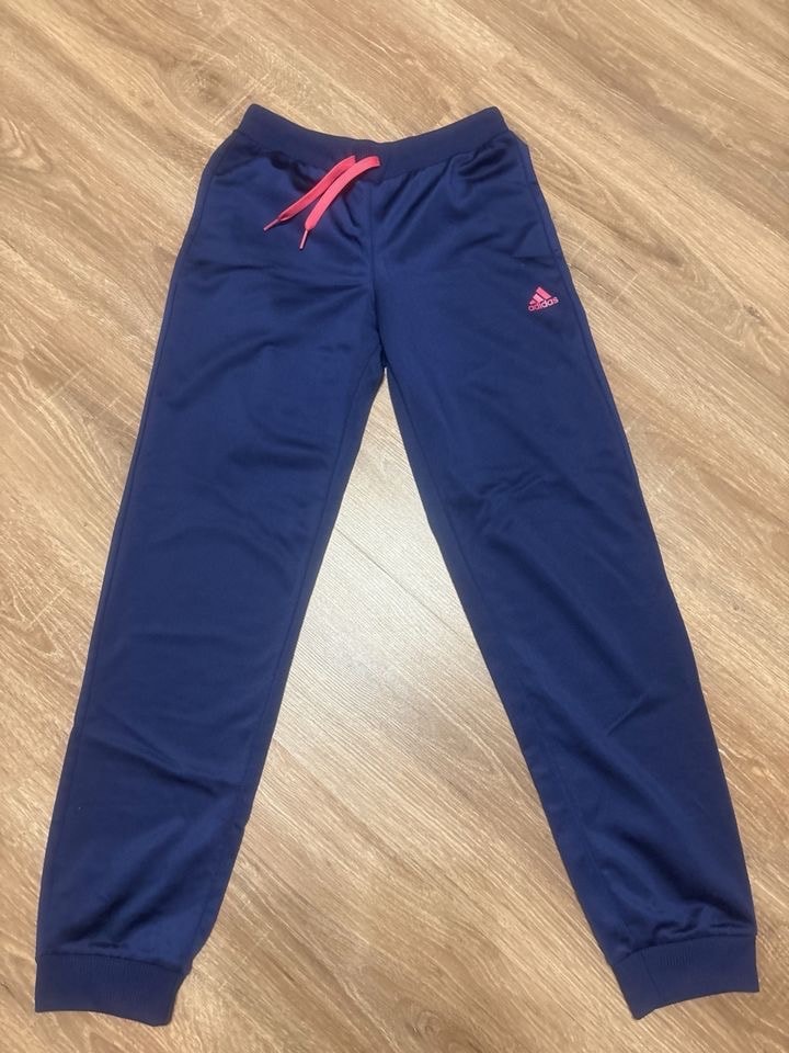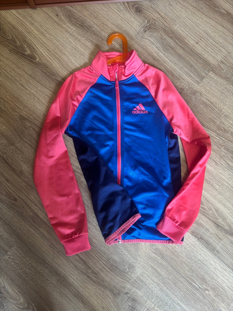 костюм спортивный adidas оригинал, яркий, глянцевый, не толстый. Маркировка 158-164, на фото Олимпийка, брюки темно-синие в тон ее спинки, по ноге, с манжетой внизу. Переобмен, мы не носили, отличное состояние. 3500