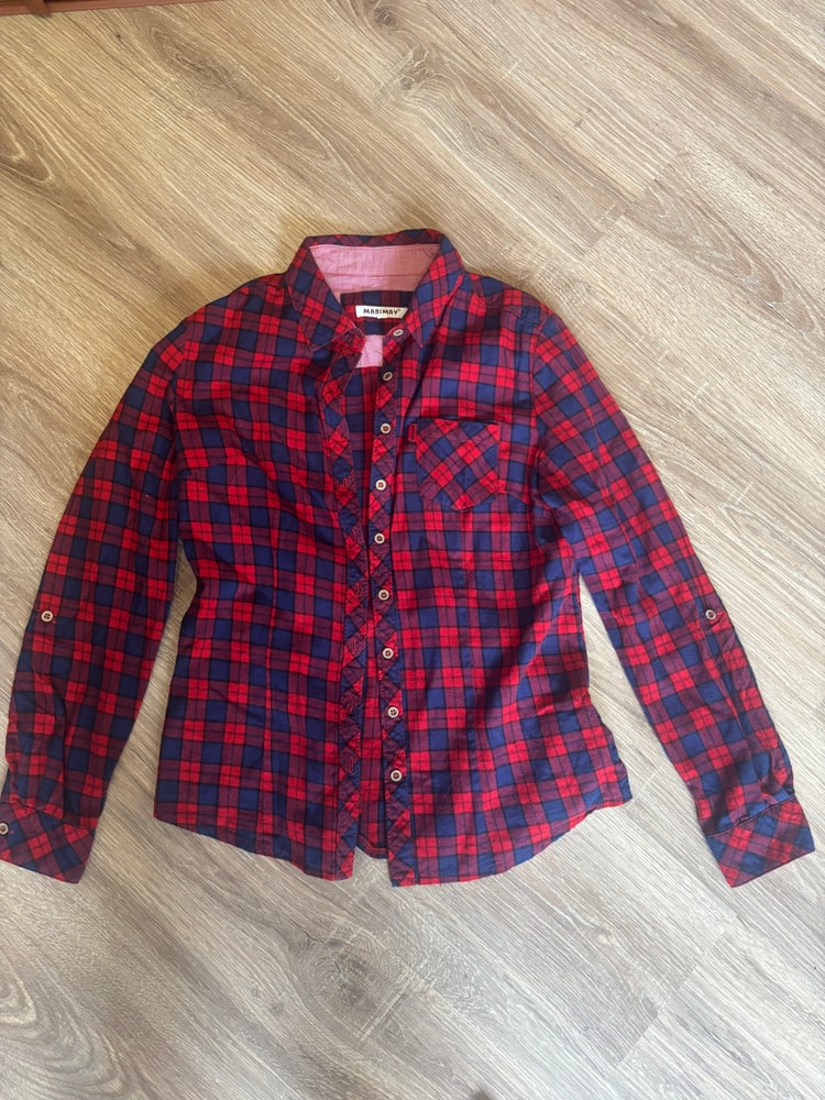 Рубашка marimay 152-158 в красно-синюю клетку, хлопок, мягкая фланель, рукава фиксируются в локте тоже. 1200