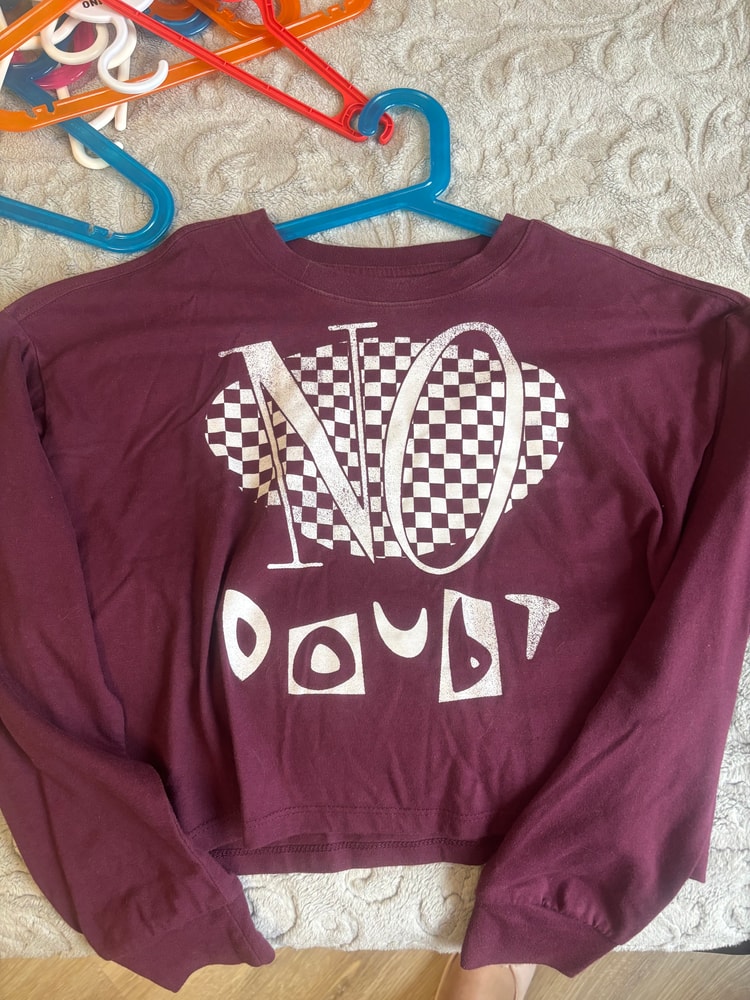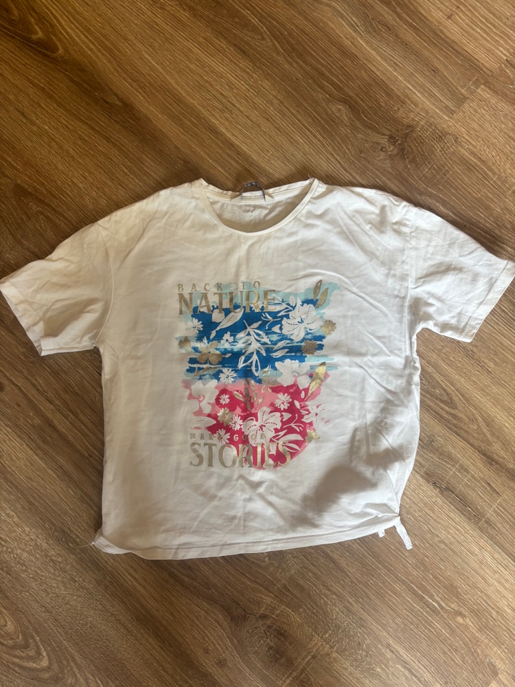 футболка укороченная оверсайз , италия, маркировка 8, от 140 до 152 смело . Есть маленькая дырочка, на фото. 500