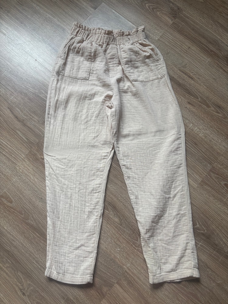 брюки из муслина lc Waikiki р 158, можно от 152, очень комфортные. На фото не поглажены. Из недочетов - в уголке переднего кармана маленькая черная точка. Прямые, свободные в меру. Есть съемный пояс из такой же ткани. Подходят подо все примерно, очень удачные) Экв 1500