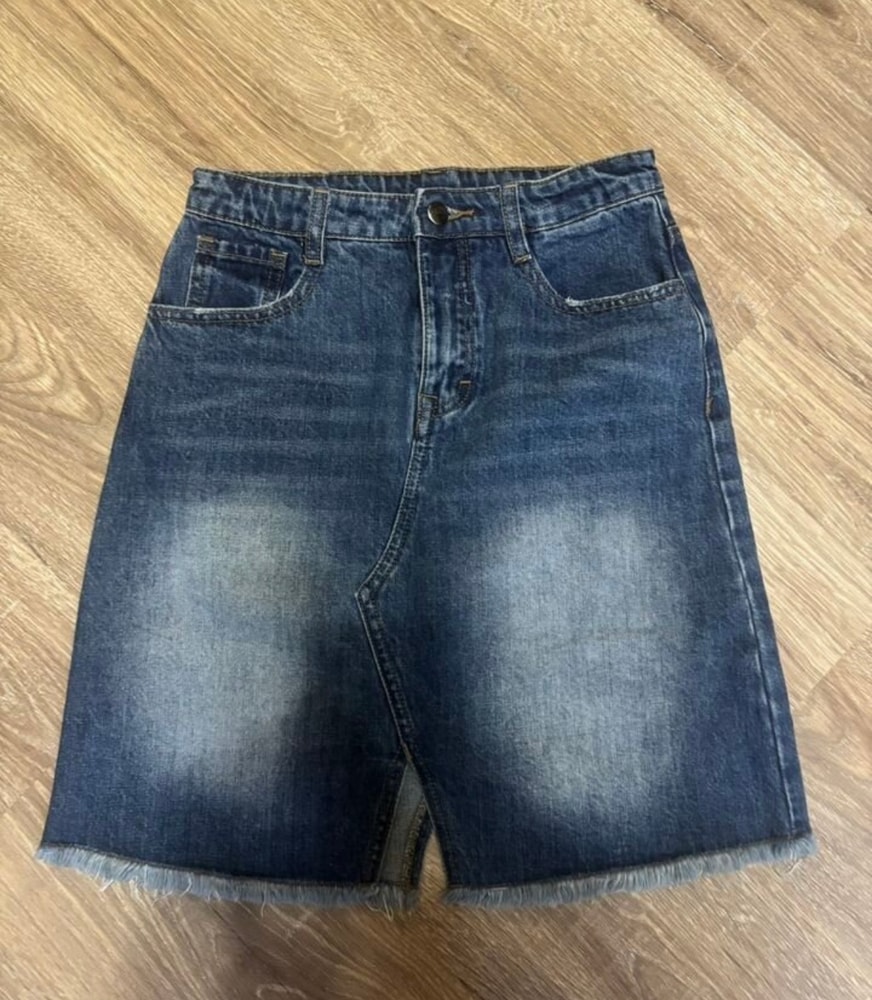 Юбка джинсовая на 134, спереди украшена чёрными стразами. 1 шт по низу отклеилась. Не заметно особо, см фото. Экв 300
