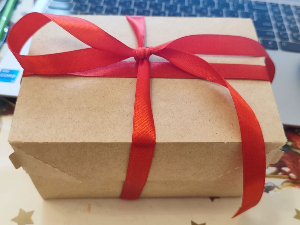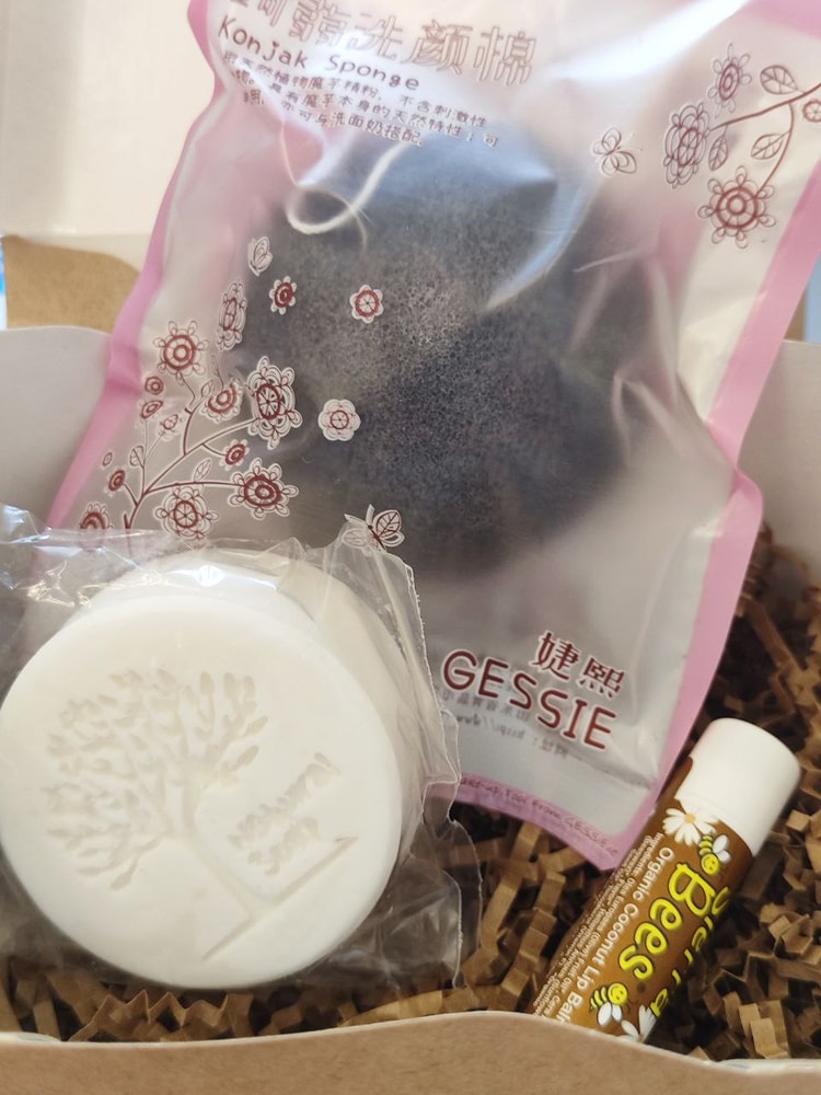 Отличный подарок к празднику. Естественно, все новое. Мыло ручной работы, бальзам для губ Sierra Bees и спонж конняку в подарочной коробочке с ленточкой. 1000р