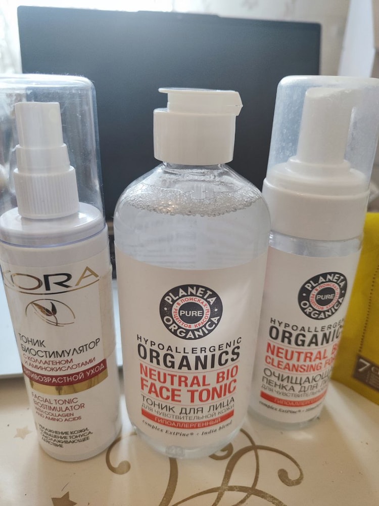 Немного косметического : 1. Тоник Kora 150мл, до 01.26, пару пшиков использовано. 300р 2. Тоник Planeta Organica, 400 мл, до 04.27, новый, не открывала. 500р3. Пенка очищающая Planeta Organica,150 мл до 03.27, осталось 2/3. 200р В подарок-Шампунь Агафья,половина от 500м.