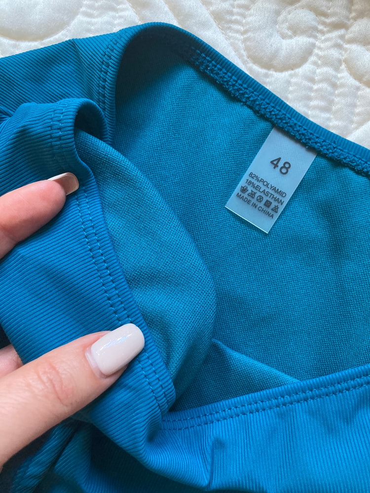 Цвет темно-бирюзовый. Мягкая приятная, хорошо тянущаяся ткань. Купальник полностью продублирован подкладочной тканью.