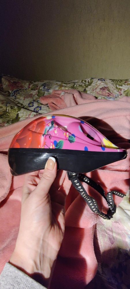 Самокат, маска с трубкой, клюшки с шайбами, шлем, лыжные ботинки.