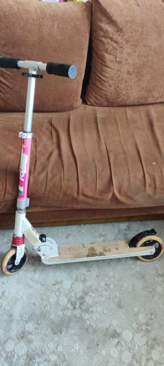 Самокат крепкий, б/у активно, присутствуют царапины. Смотрите фото. Диаметр колес 14,5 см. До 80 кг. Экв. 2500