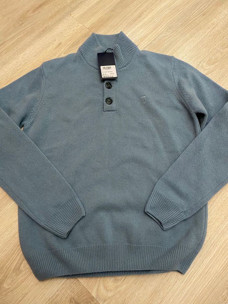 Свитер поло trussardi оригинал , 100 проц шерсть. Маркировка М, оказался мал. По груди 53, рукав внутри 49. Экв 13500