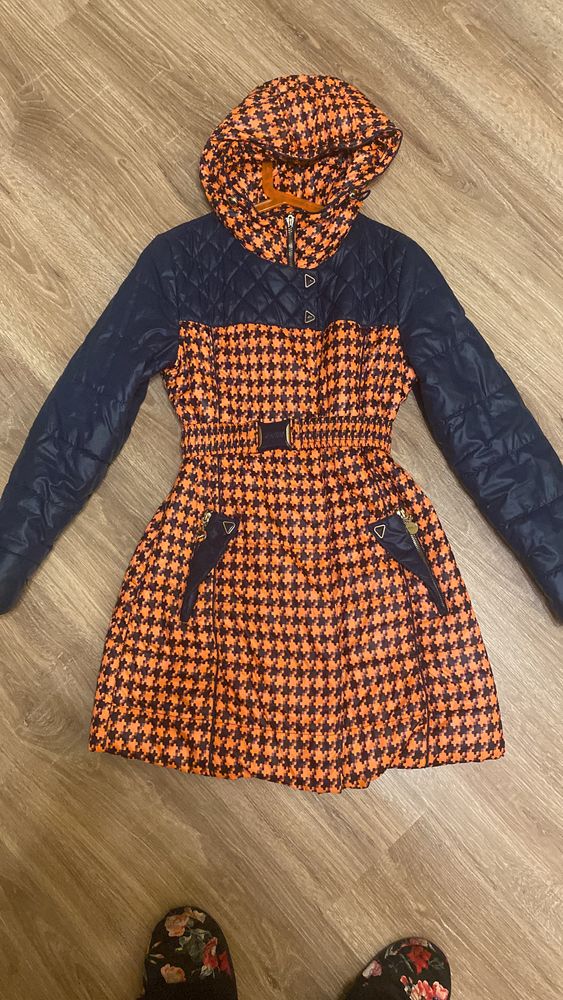Демисезонное пальто на весну-осень, р 146, можно чуть меньше. капюшон с утяжкой, карманы на молниях. Все молнии рабочие. Есть мелкие недочеты: надо подшить карман один немного, оторвана самая нижняя кнопка, сзади на попе на ткань небольшой порез на оранжевом фоне (за счет рисунка сами недавно заметили, но в идеале зашить в ателье. Экв 1000