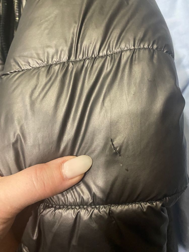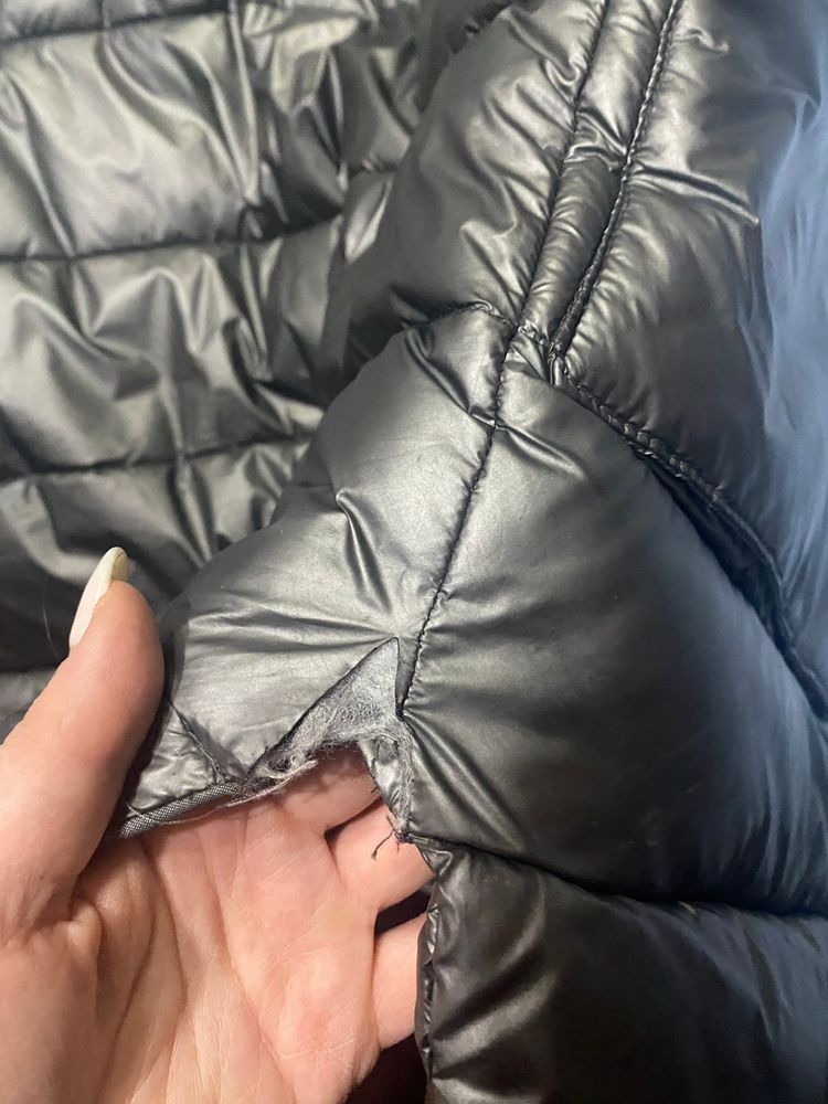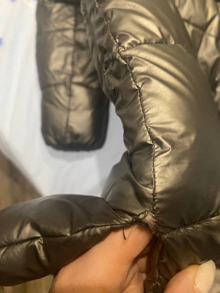 Есть мелкие недочеты: сломан язычок молнии, у шеи с одного декоративного кольца слезла черная краска (на фото видно - оно серебристое), у карманов легкий блеск (в идеале химчистку сделать или вывести пятновыводителем).