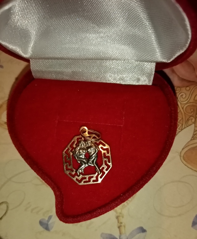 подвеска "близнецы", фото на телефон, плохо видно- ободок- желтое золото с фианитами, близнецы выпуклые из белого золота. Вес пока не знаю, меняю на иконку такого же формата. экв. 15 000