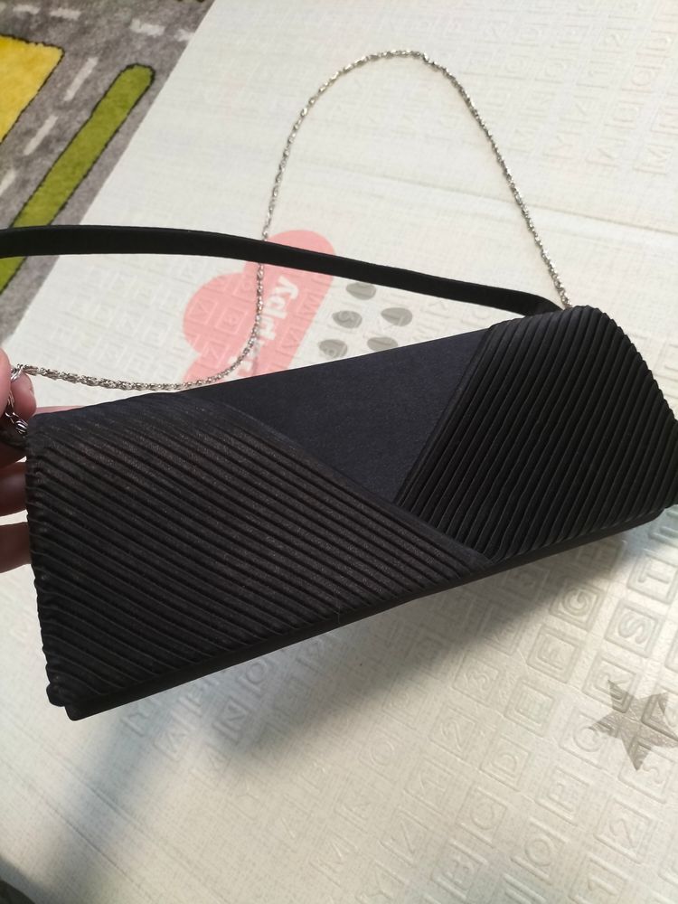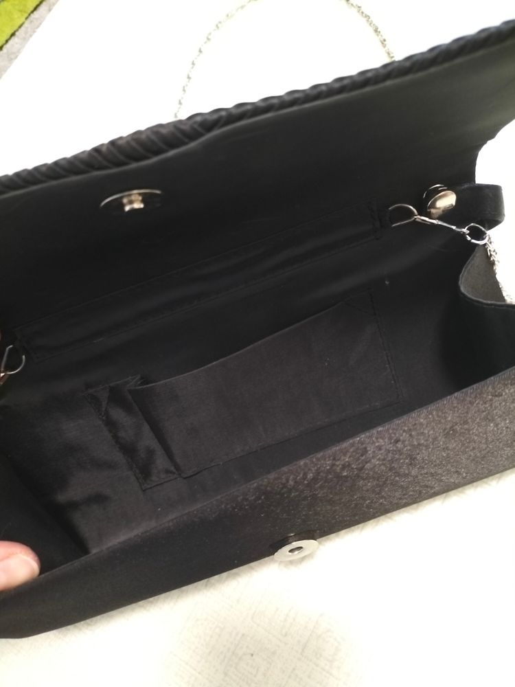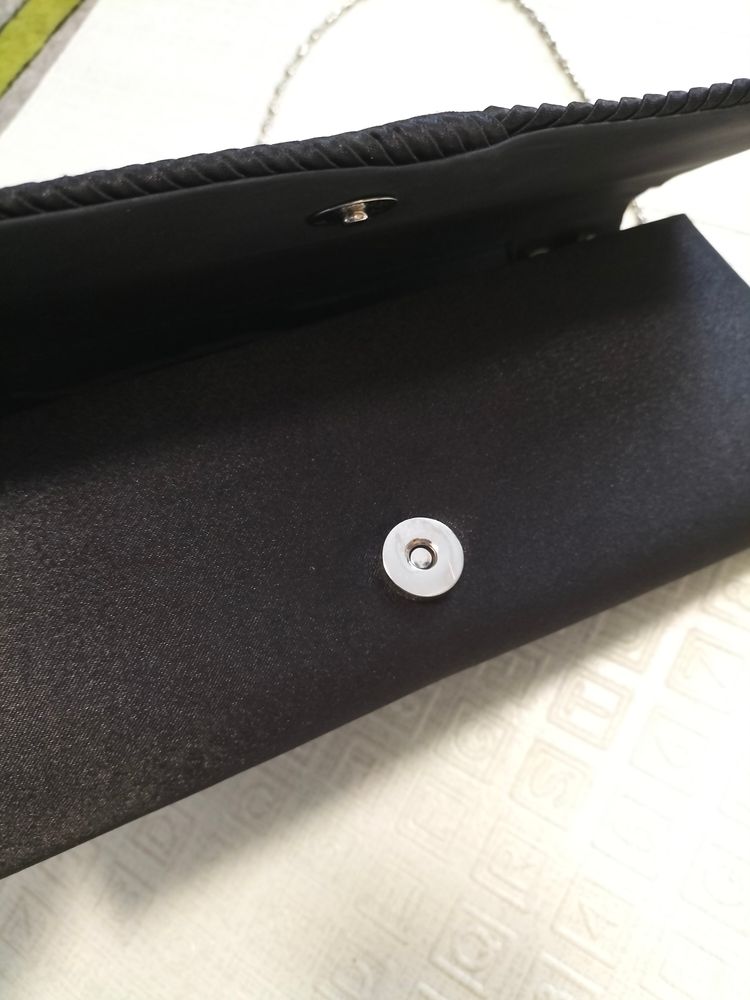 Клатч из черной атласной ткани, в отличном состоянии, б/у 2 раза, можно носить на серебряной длинной цепочке или на небольшой черной ручке, обе отстегиваются. экв. 1000
