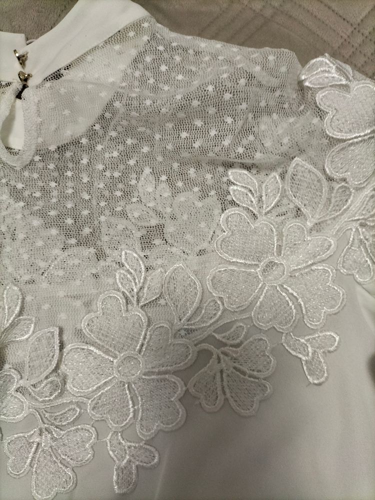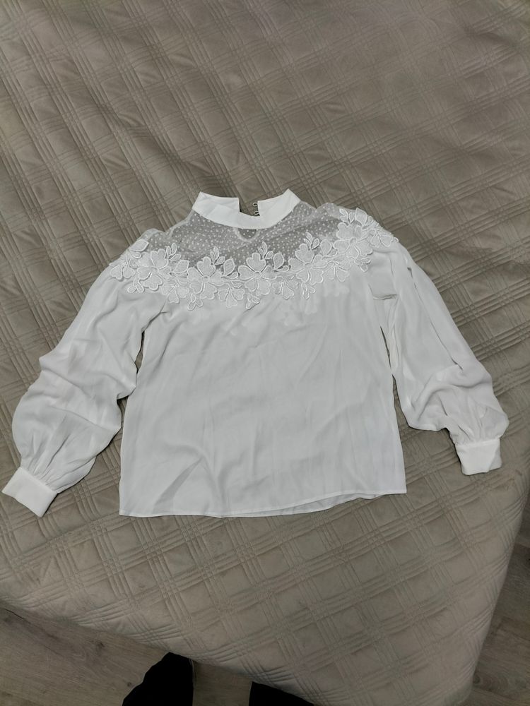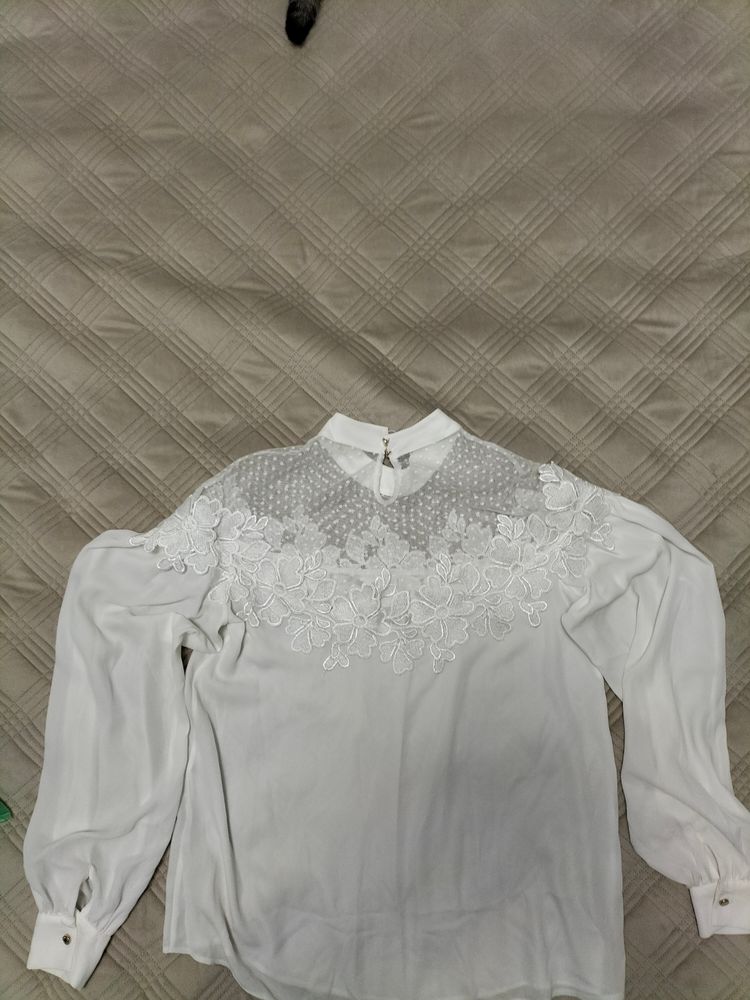 Блузка праздничная белая, размер 44, турецкого бренда, постирана, НИ РАЗУ НЕ ОДЕТА. Приятная ткань, модель свободная, широкий рукав предусматривает его нависание над манжетом, сетка и вышивка по верху плеча, не доходит до груди. Воротник-стоичка, сзади на пуговичках Экв. 1500.
