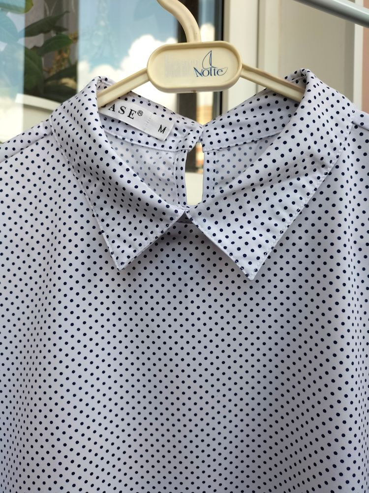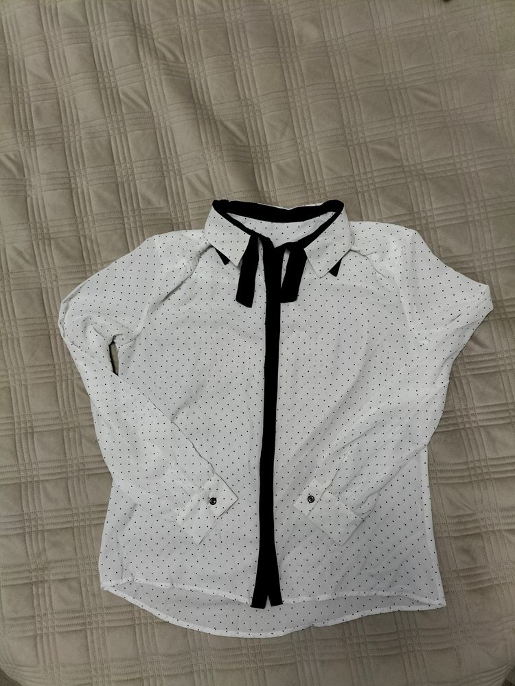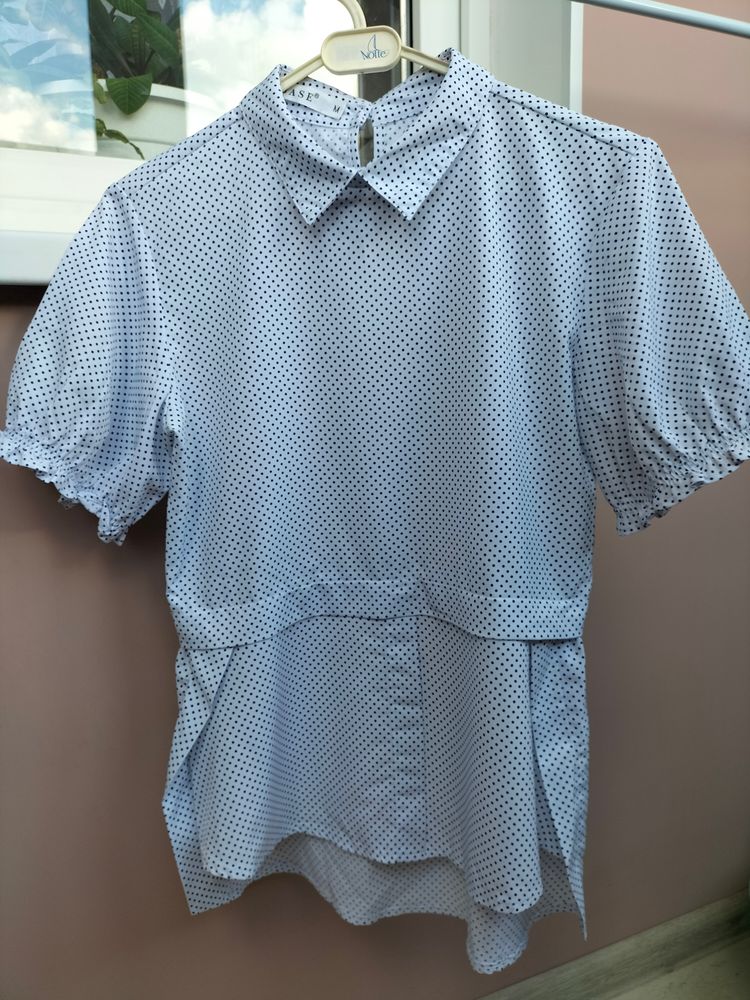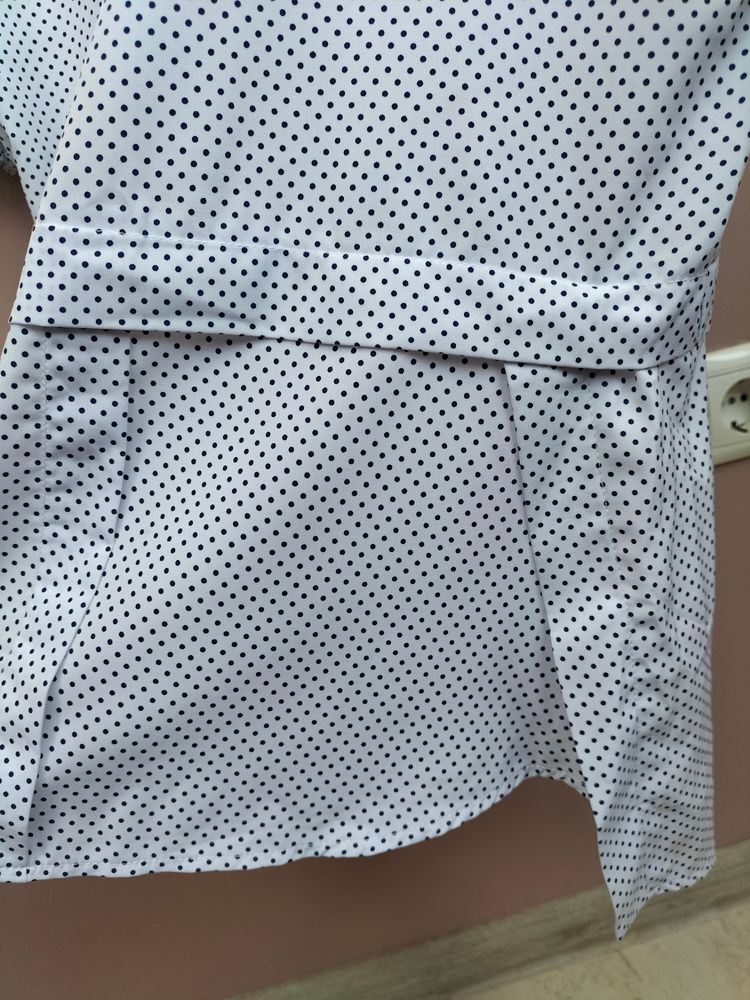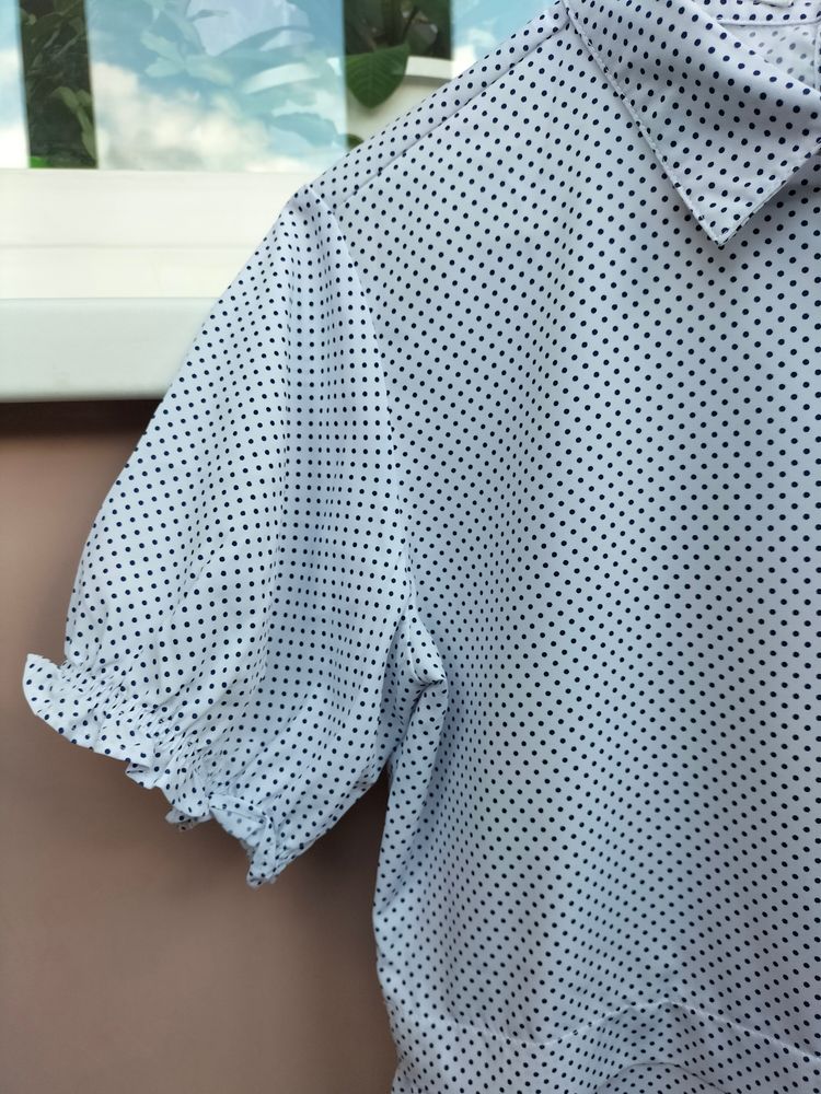 Нежнейшая белоснежная блузка в тёмно-синий горошек, в идеале, 42-44, под брючки просто супер, экв. 800