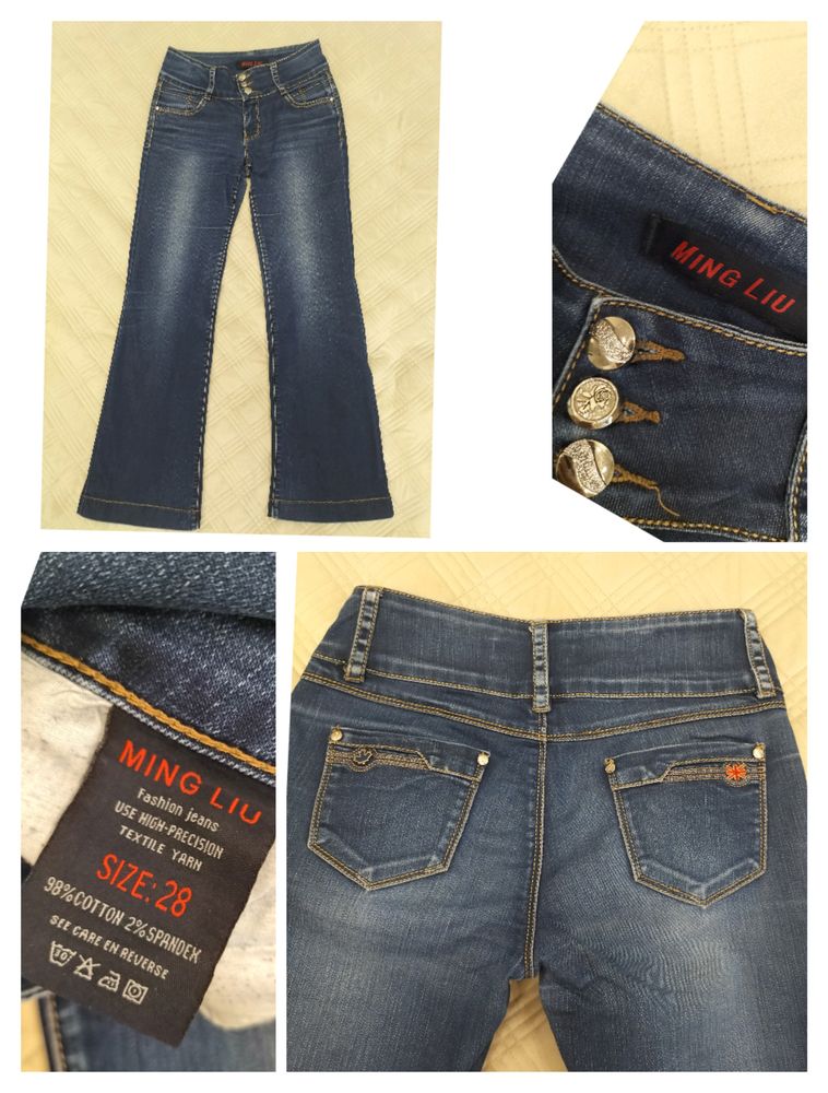 Джинсы фирменные, темно-синие, клёш от колена, очень модные, идеально сидят, б/у активно, но они все ещё в очень хорошем состоянии. Разм 44, экв. 500, немножко низы с внутренней стороны потерты из-за носки под каблук