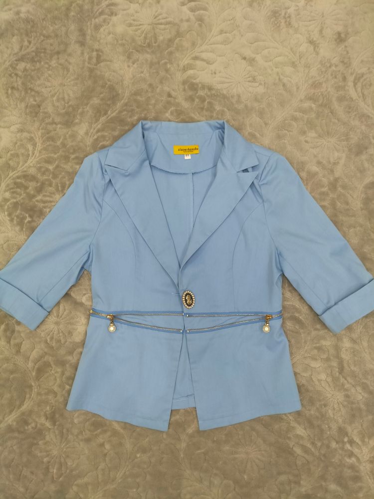 Пиджачок без подклады, лёгкий летний, очень нежный цвет, золотистая фурнитура, рукав 3/4, отлично и под юбку и под джинсы, на разм. 42-44, экв. 300
